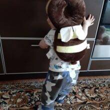 This little bee backpack has literally been a life saver. My 10 month old has been wearing it consistently for the past month and a half and it has saved him from smacking the back of his head on our tile floors too many times to count. He was a little interested in trying to pull it off when we first put it on, but now he wears it all the time and doesn’t seem to even notice it is there. Such a simple, cheap, and effective solution for a common baby issue.